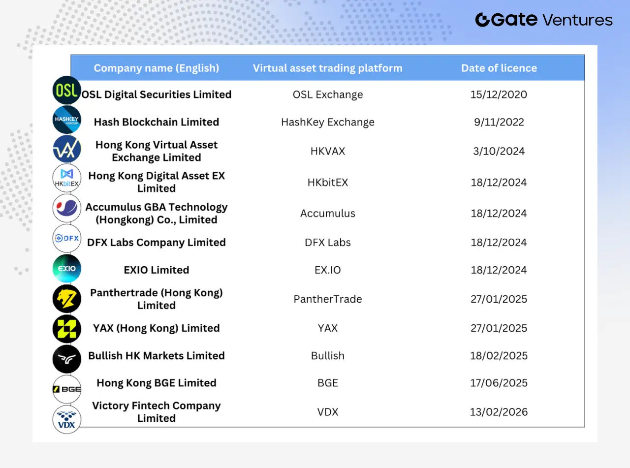 Au premier semestre 2025, la nouvelle a fait la une : les courtiers traditionnels ont massivement migré vers la catégorie 1 pour entrer dans la sphère des actifs virtuels. Plus de 42 institutions ont été approuvées pour offrir des services de trading via des comptes omnibus : Guotai Junan International, Futu Securities (Hong Kong), Interactive Brokers, ZhongAn Bank, etc. En juin 2025, Guotai Junan International a obtenu la “licence complète pour les actifs virtuels”, ce qui a fait bondir le marché hongkongais de près de 200 % le lendemain. (3)