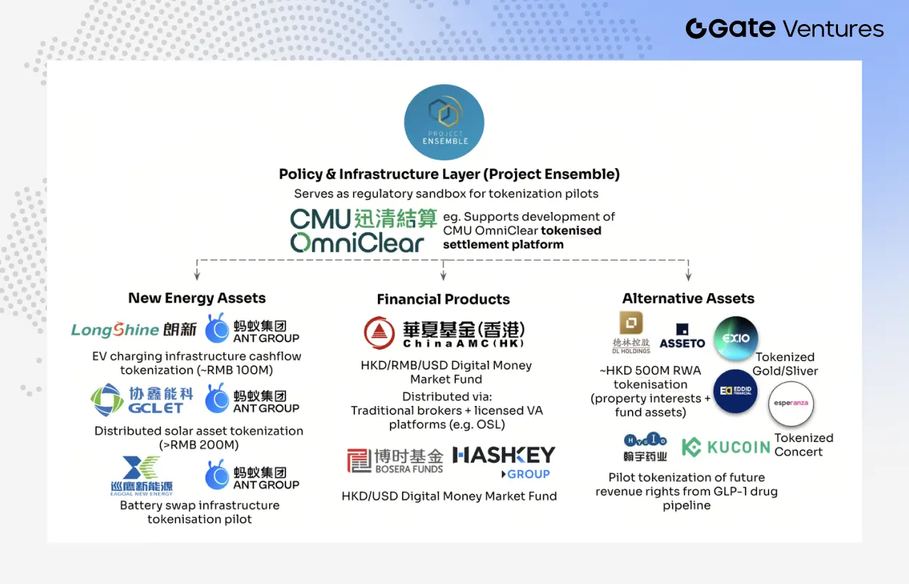 En août 2024, la Hong Kong Monetary Authority (HKMA) a lancé le sandbox Project Ensemble, concentré initialement sur quatre axes : revenus fixes et fonds d’investissement, gestion de la liquidité, finance verte, commerce et supply chain finance. Par la suite, plusieurs projets de tokenisation et RWA ont émergé, illustrant une transition du concept à la pratique.