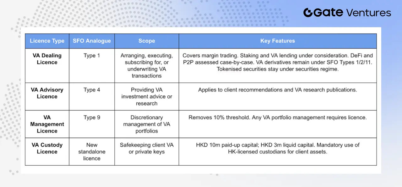Licence de gestion d’actifs virtuels (VA Management), correspondant à la licence 9 du SFO, pour la gestion complète de portefeuilles d’actifs virtuels pour le compte de clients. Une évolution clé : la suppression du seuil de 10 % de la valeur d’actifs en actifs virtuels dans le portefeuille, qui auparavant déclenchait une régulation renforcée. Désormais, toute gestion de portefeuille comportant des actifs virtuels doit détenir une licence spécifique, quel que soit le pourcentage, évitant ainsi le risque de dépassement passif dû à la volatilité du marché.